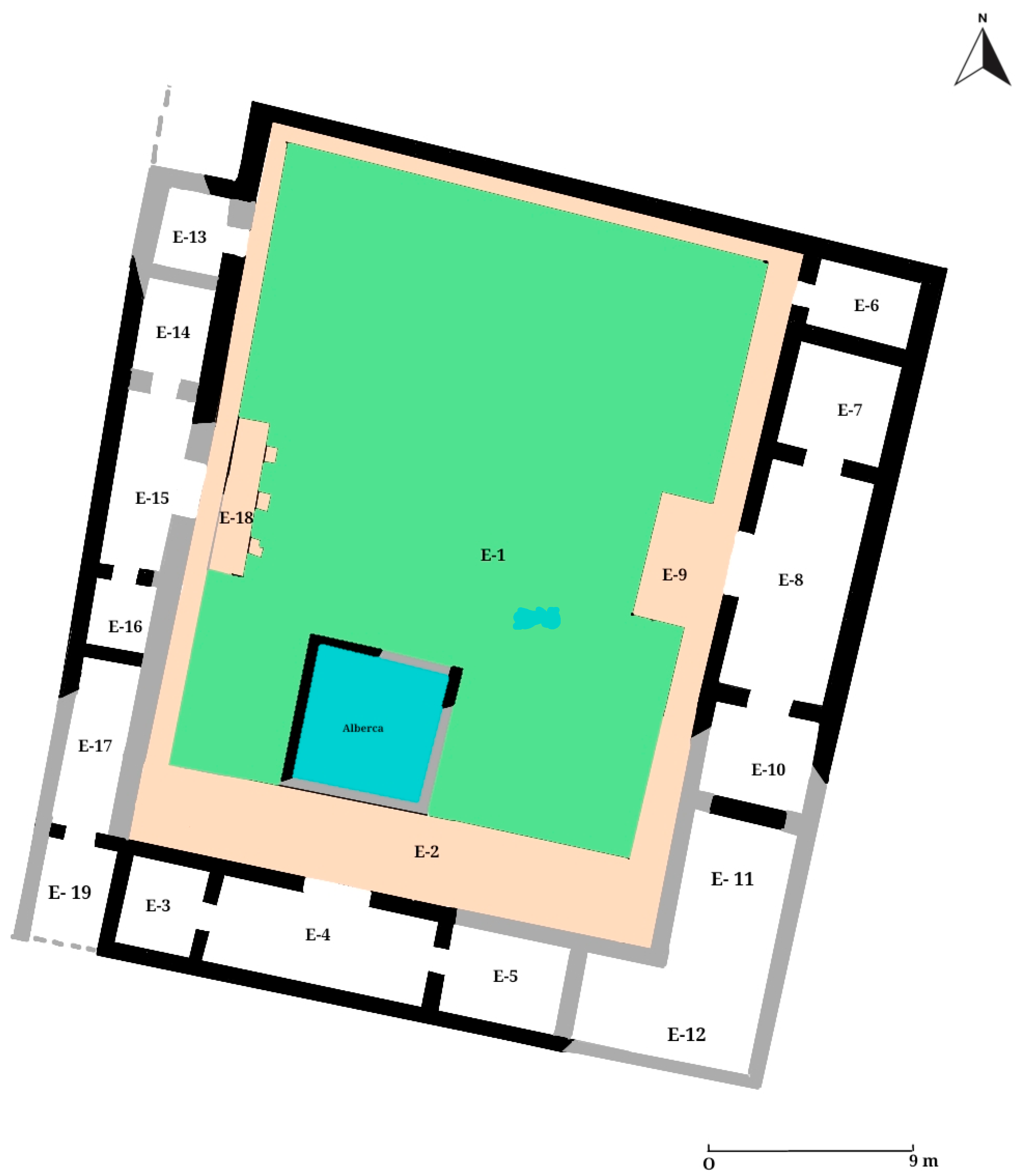 López-Cuevas 2014, pp. 169–70). In the case of Building 1, we indeed find three bays that follow the same axial scheme. The main space, however, like the pool, was located to the south and oriented towards the north. This orientation would have resulted in almost no exposure to sunlight, an effect further reinforced by the presence of a porticoed space between the hall and the courtyard rather than just a perimeter platform. No similar northward-oriented spaces have been found.