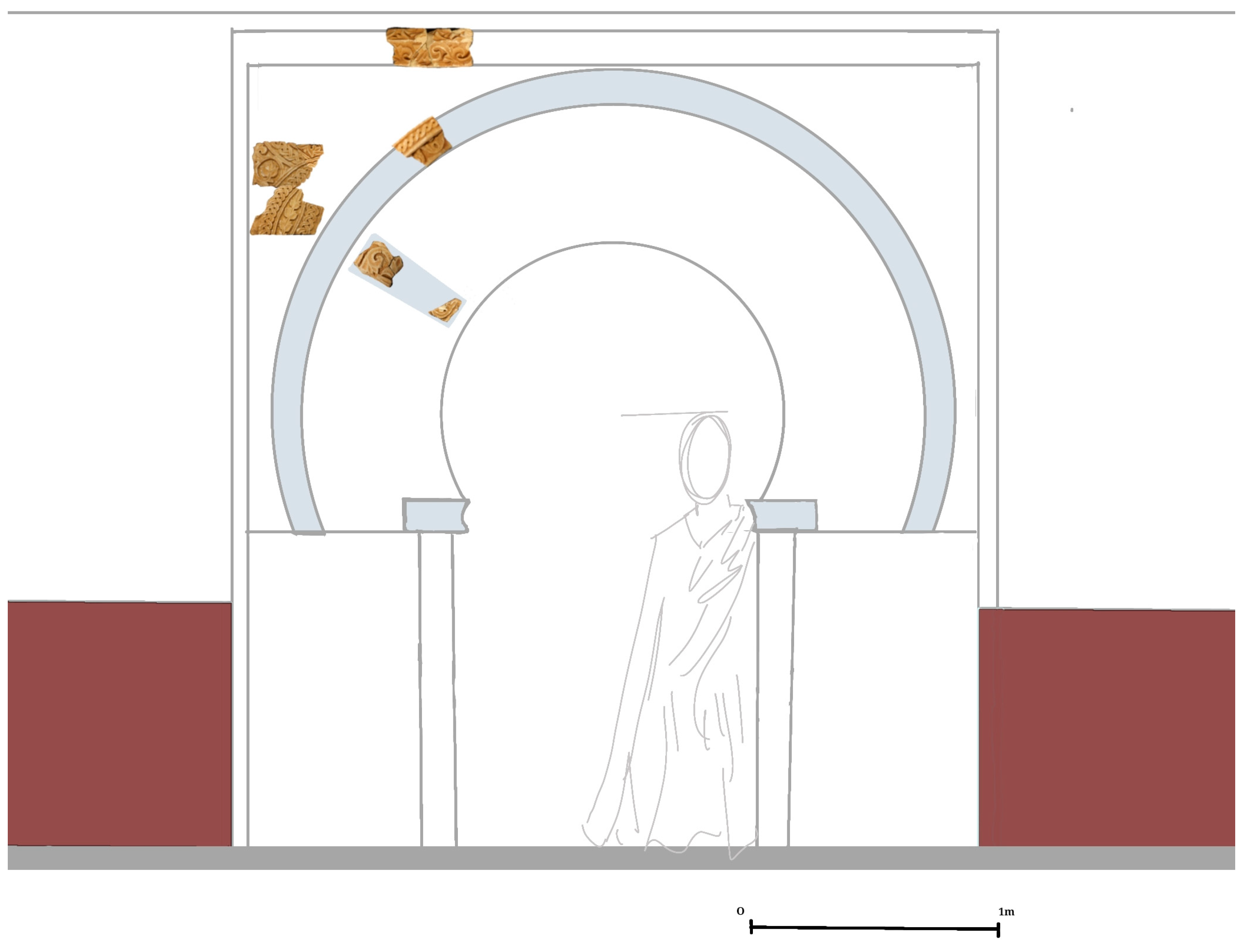 For this location, we estimate the presence of a 6-m-wide opening with a central arch framed within a decorative programme measuring 3 m across and 3 to 3.5 m in height (