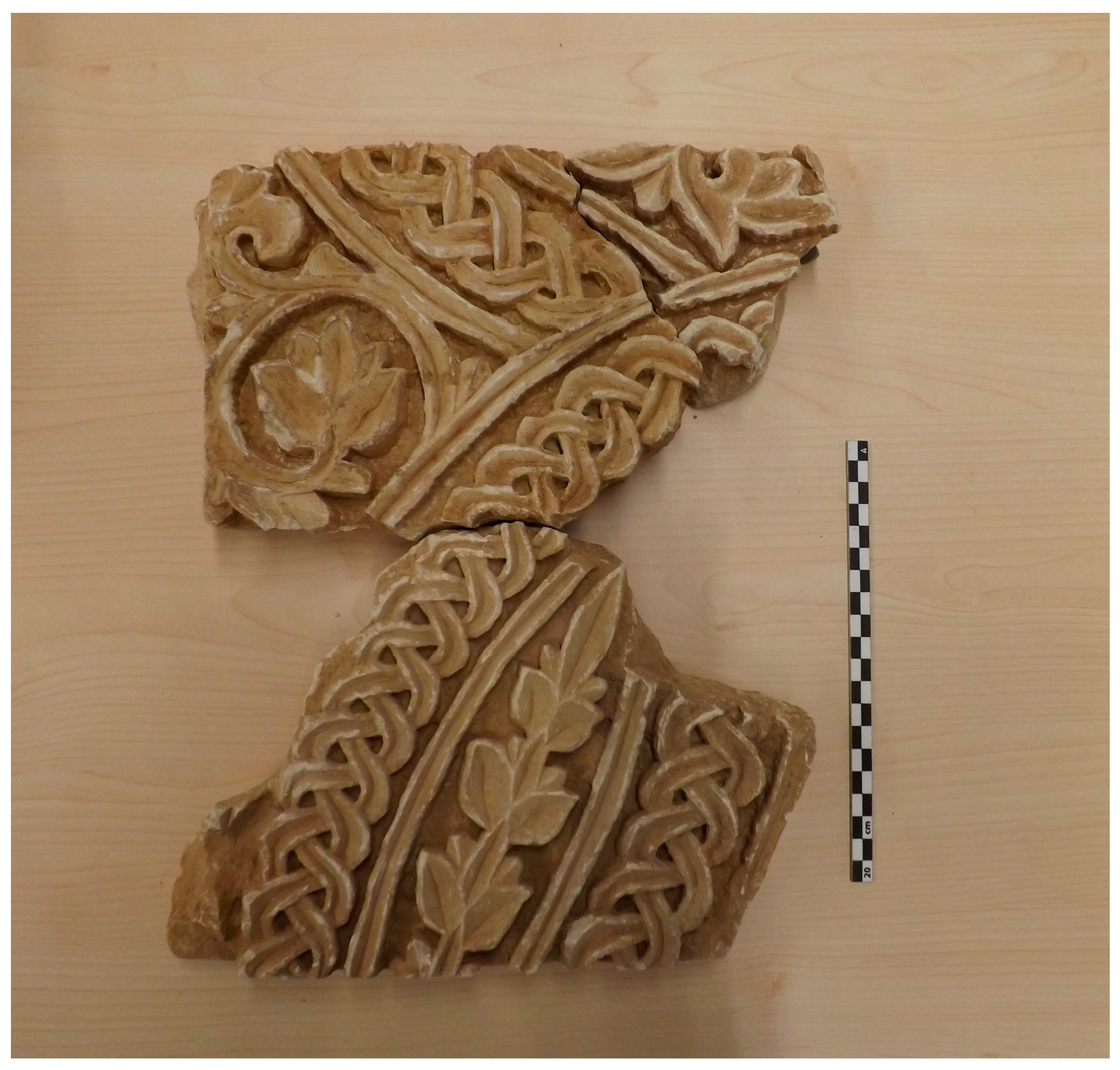 Once the carving was completed, polychrome decoration may have been applied. In the case of Building 1, however, polychromy has only been documented on the fragments that formed the star (analysed below). Finally, the pieces were affixed in their positions with lime mortar, which, in the case of friezes and panels, also served to fully integrate them into the architecture.