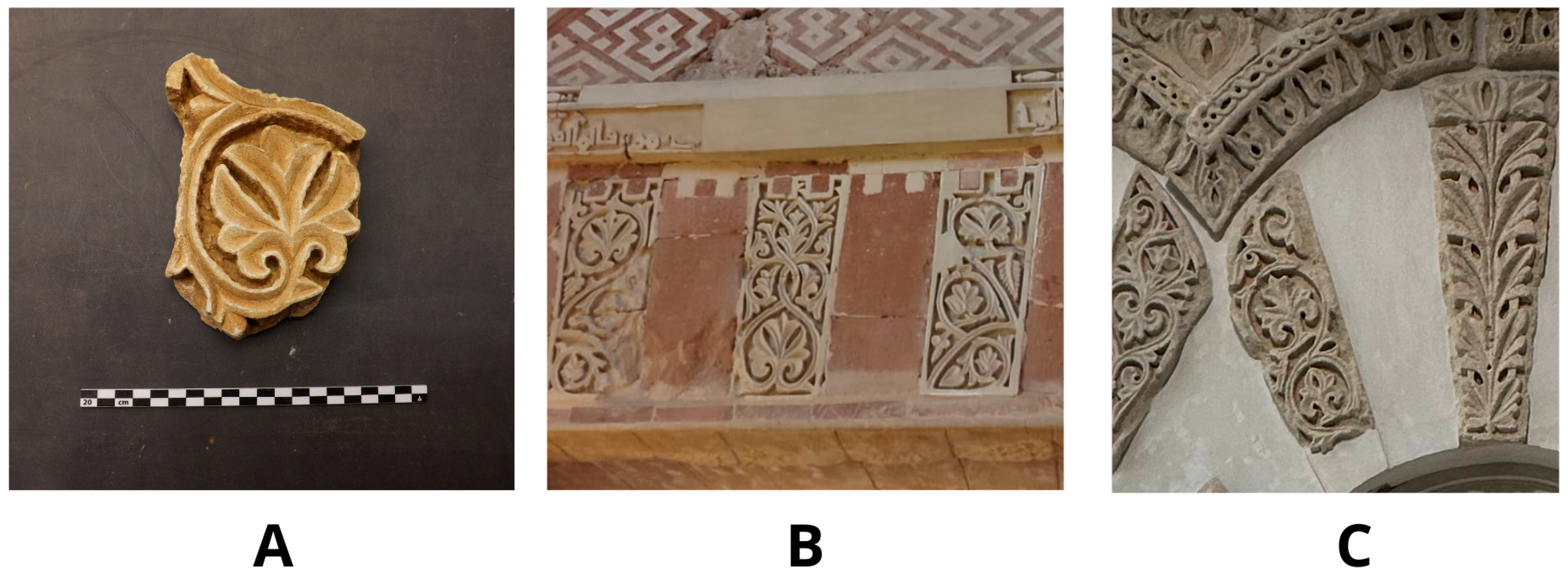 Anderson et al. 2021, pp. 131–52). This could suggest that, at the time of construction, no decorative programme with ataurique was planned, but that some additions were made at a later stage, perhaps when the ownership of the property changed. Likewise, the absence of ataurique carvings at Munyat Ruṣāfa could be explained by the partial nature of excavations or the early date of the complex’s construction without this example’s being considered a counterargument to the above premise.