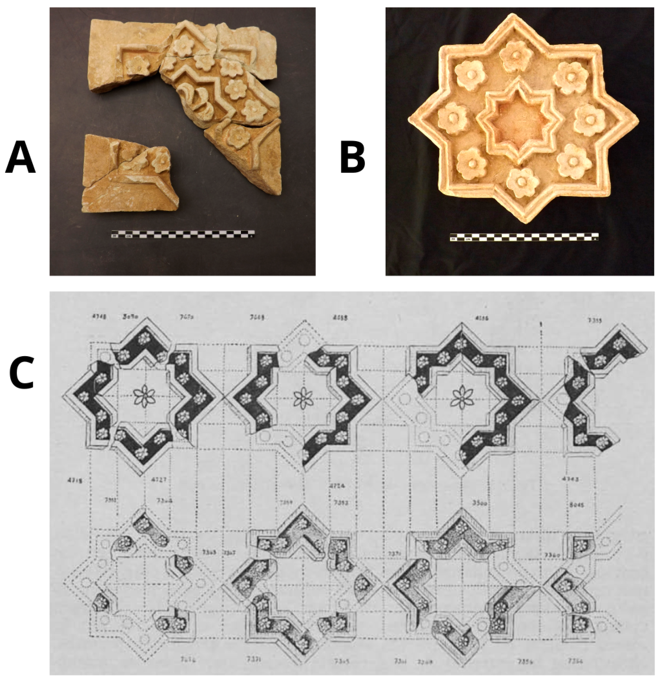 Figure 12B), also featuring eight points, though not inscribed in a square, with another eight-pointed star in the centre and six-petalled flowers in its design. This example preserves polychromy on the inner star and similarly shows no work on the reverse. Similar examples come from the excavation of the mosque of Madīnat al-Zahrā (