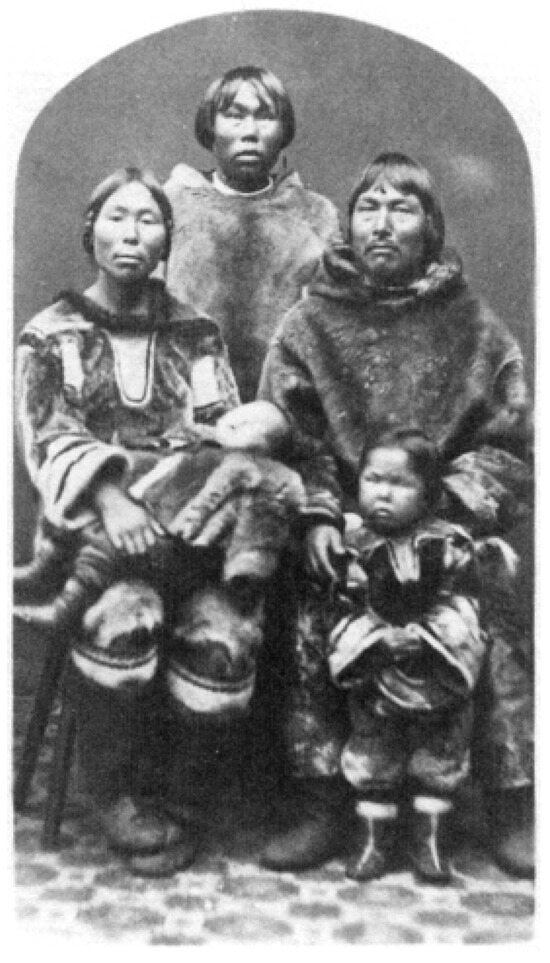 Abraham Ulrikab with his family. From left to right: Ulrike with daughter Sara in her lap, son Tobias, Abraham Ulrikab with daughter Maria standing before him. Photograph taken during Hagenbeck’s Human Zoo display of the “Eskimos” 1880/81. Photo by Johann Adrian Jacobsen. Public domain, Wikimedia Commons: https://commons.wikimedia.org/wiki/File:Familie_Abraham_Ulrikab_1880.jpg, accessed on 1 March 2025.