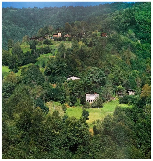Local builders have made up their own lives against all kinds of prerequisites of nature and all kinds of difficulties brought by the topography. Instead of treating nature as an obstacle to ‘cope with’ as modern technology does today, they made use of the best out of nature. Because of the mountainous topography of the Black Sea region, local folks built their houses at the point where they are easily able to control their territory. The geography forces local folks to build self-sufficient housing units that can meet all their needs. They have efficiently used the natural resources and materials provided by nature and have created their own environments by using local materials that are easily accessible in the nearest environments (Bayram 2014). In doing so, they evaluated the climatic conditions of the region very well, mastered techniques to protect them from the harmful effects of nature, tried to prevent heat losses by using local materials and are hiding in nature. Figure 2 shows how the houses of the community are placed in between nature, with nature providing the necessary protection for the community.