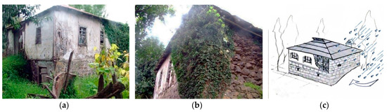 Precaution for Karayel on a vernacular house: (a) north-east facade of the building in Giresun (Photographed by Ömer Faruk Bayram); (b) north-west facade of the same building (Photographed by Ömer Faruk Bayram); (c) illustration of the precaution for Karayel (Drawn by Ömer Faruk Bayram).