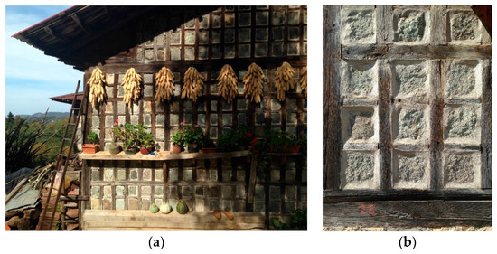 (a) Wooden facade with stone as filling material (Photographed by Ömer Faruk Bayram); (b) Relation of wood and stone in detail (Photographed by Ömer Faruk Bayram).