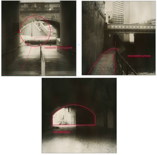 In the particular study locations of Castlefield, Manchester and Hackney Wick, London, there were a number of key concerns for project participants such as a lack of places to sit and rest in the urban realm, a lack of accessible and connected up green space, challenges in the physical landscape due to barriers to mobility, distances to essential amenities, unclear routes and difficulties with way-finding, absence of feelings of safety, among others. Research representations of these particular age-friendly issues used mappings, diagrams, annotated photographs and three-dimensional drawing to illustrate a body of ‘place-specific, age-friendly concern’ (see Figure 4).
