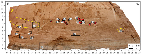 Orthophoto of the Nabara 2 shelter. The origin of the metric reference frame is set coincident with the eastern lower corner of the shelter. Stars indicate oval engravings; squares indicate painted compositions. Blobs bound major clusters of white cattle figures. Labels P1–P9 and E1–E9 refer to the engravings and art locations mentioned in the text.
