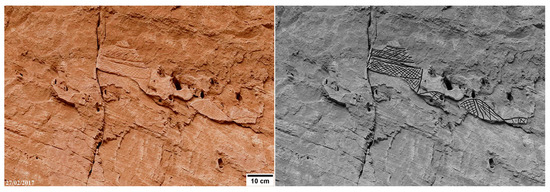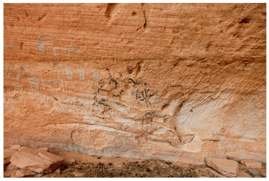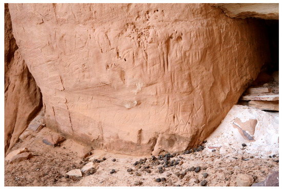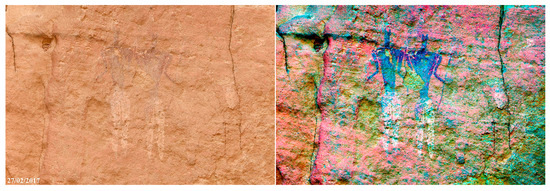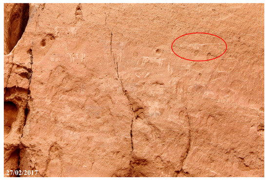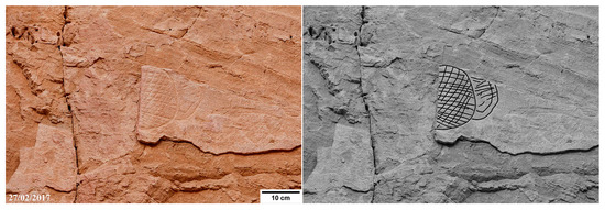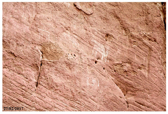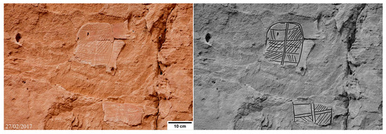 Engraved camels with the hump-body stylized as a triangle and linear marks decorate the base of the rock spur flanking the eastern side of the cavity (Figure 5). On the eastern sector of the shelter’s bottom wall, near to the ground (P1 in Figure 4), pecked camels with the hump stylized as a semicircle, sketchy camels, and other crudely drawn quadrupeds painted in white, grey, and red are shown (Figure 6).