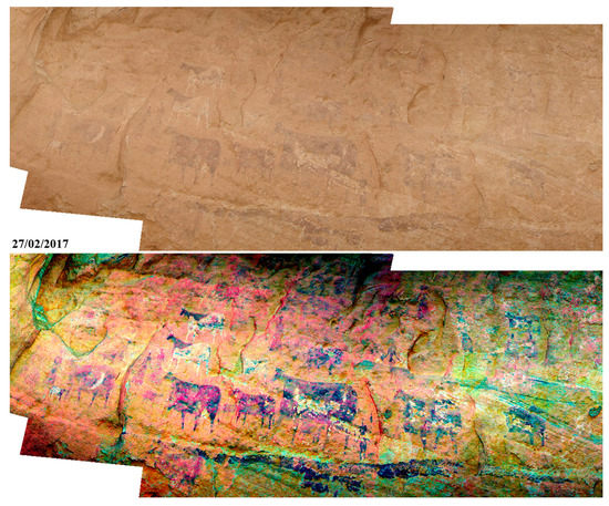 A large composition (P3) comprehending three women and two warriors, one armed with a spear, standing amid a cattle herd (Photo: Alessandro Menardi Noguera). The upper image is a photo-mosaic compiled by stitching three high-resolution pictures (on the lower half: enhanced version of the mosaic in DStretch LAB colour space).