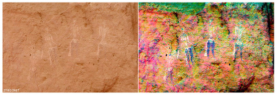 Four figures wearing white clothes, at 4.5 m above the shelter floor at P5 (Photo: Alessandro Menardi Noguera). Legs are painted in dark red (enhanced version to the right in DStretch LAB colour space).