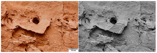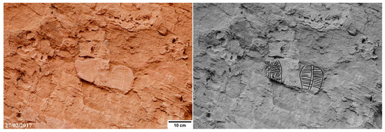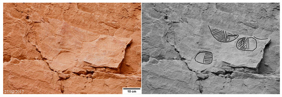 The oval engraved petroglyphs decorating the upper section of the shelter bottom wall, between 7 to 9 m, make Nabara 2 an unparalleled site in the varied rock art landscape of the Ennedi (Figure 15, Figure 16, Figure 17, Figure 18, Figure 19, Figure 20, Figure 21 and Figure 22). Within an area extended about 40 m2, 27 oval engravings are counted. Their deeply engraved outlines, acting as lines of weakness, sometimes favoured the detachment of pieces of rock, giving origin to elliptical gaps. This sort of mould indicates the former existence of many more oval engravings than it is possible to see today. Most of these engravings are just fragments, which survived the intense erosion of the original rock surface. Fortunately, their symmetric shape easily allows imagining these fragmentary motifs in their completeness. Among over 27 engravings, only three are devoid of internal graphical elements. Dimensions are in the 10 to 40 cm range. The most significant ones of the inventory, listed according to their location from east to west (Figure 4), are the following: