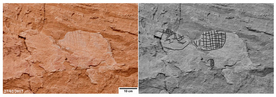 Fragmentary engravings (E1 and E2 in Figure 4), decorated with an internal motif resembling a framework and patterns of angled lines (black and white version: interpretation by tracing, Photo: Alessandro Menardi Noguera).