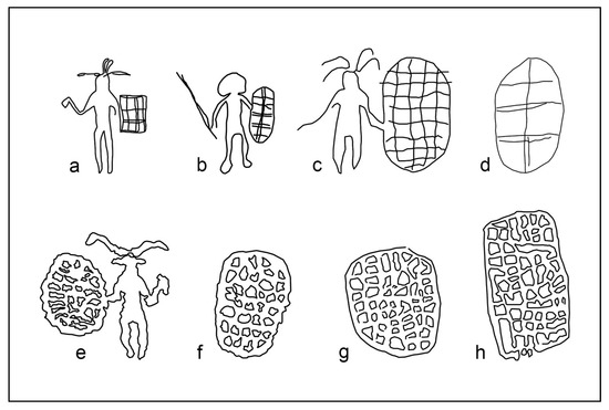 The “a” petroglyph (Figure 23) evidently does not relate to an oval object but to a square one, which resembles a kind of square wickerwork shield widespread in Central Africa (Figure 33 in Benitez-Johannot et al. (2010); Quais Branly Jacques Chirac Museum (http://www.quaibranly.fr/fr/explorer-les-collections/), online collections, Inventory number 71.1935.80.95). The profile of the object held with the right hand in the “a” petroglyph recalls the African traditional mace still in use in Africa up to historical times among the Peul of Sub-Saharan Africa, as well among the tribes of South Africa (Quais Branly Jacques Chirac Museum, online collections, Inventory number: 71.1908.13.138 and 71.1942.0.394 X). The interpretation of this specific figure provides more support to the interpretation of the other human depictions surveyed in Anoa-1 as warriors equipped with a certain variety of shields and offensive weapons. Although each African ethnic group tends to have its distinctive kind of standard shield, pictures preserved in the Pitt Rivers Museum photographic collection, shot at the end of the nineteenth century, show tribal squads of African warriors equipped with shields of different shape and building technique (e.g., accession numbers 1998.209.43.7 and 1998.203.1.65.2; Pitt Rivers Museum 2017).