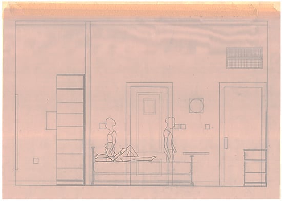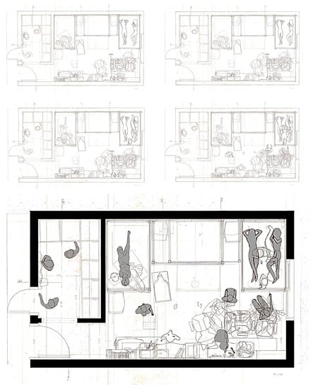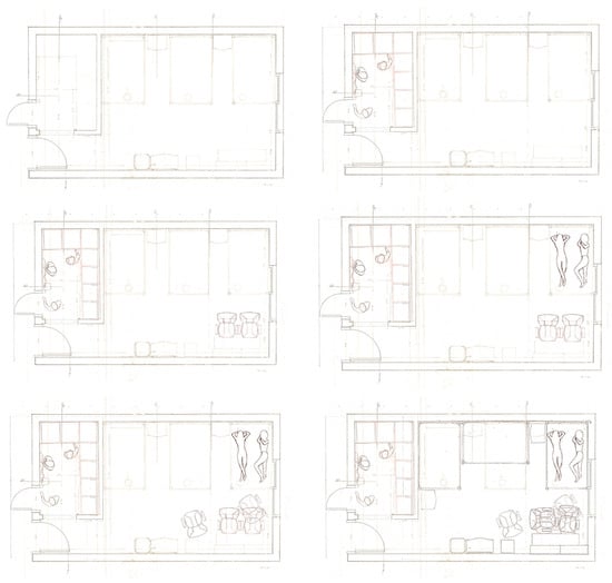 Plan orthographic drawing of the bedroom space, showing the five steps: periphery, fixed and movable elements, immateriality, zones of occupation and body movements; showing the layered level of investigated documentation and the final drawing outcome.