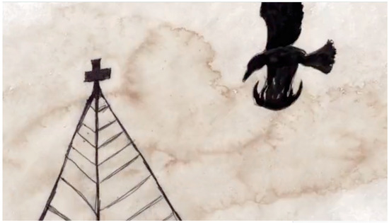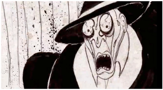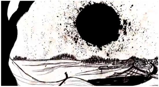 This nightmare of a mind in free-fall is an animator’s dream. Baldvin’s pen dances in tandem with the flux and flow of this splintering mind, translating its aberration into line and blob. Every animator knows the passion for a world that buckles to the will of its creator but rarely is the animator’s art so perfectly matched to its task. Baldvin is a master of what the great Soviet filmmaker, Eisenstein, called the ‘plasmatic’—the endless capacity of form to morph and mutate in the hands of the animator (Leyda 1988). Bringing inert matter to life is the core of animation and Baldvin’s trump card is the way he applies this principle to both figure and ground. Not only does the wing of a crow in flight amplify and curl upward in a sinister snarl; the sky the crow flies through also breaks out into a pox across the skin of the screen and the borders of bodies melt into the disease that spreads across the disintegrating frame (Figure 5). The stark division of black ink and white frame is a perfect analogue for this bipolar universe and the blotches that break out across the image a cryptic cipher for its unravelling.