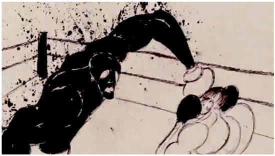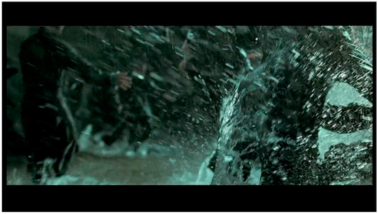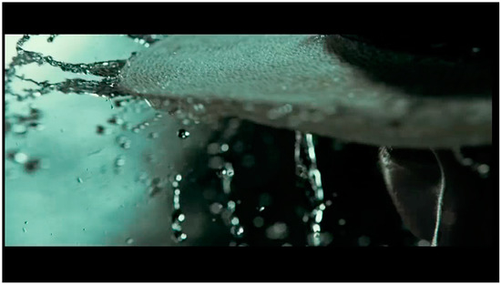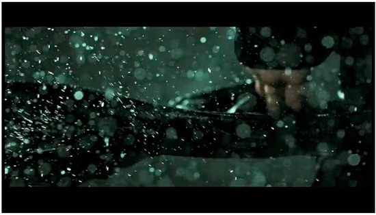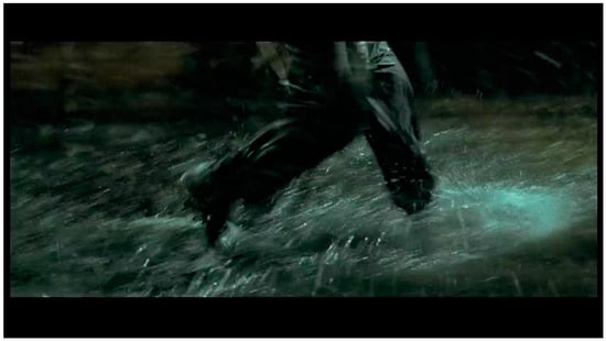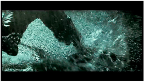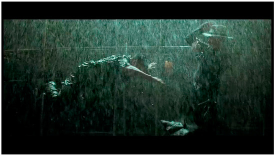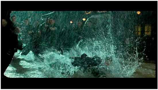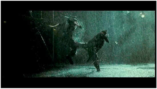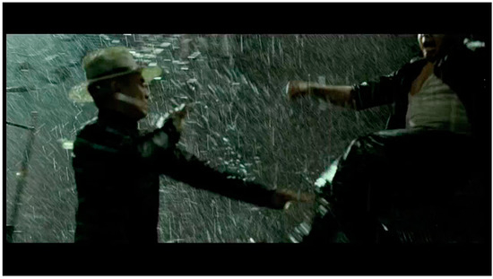 The body punches the pavement, streaking, pounding, striking, beating. Another axis, crashing against the upright human bodies and those that skid across the ground. The body of water punches the ground as the human bodies block, throw, lunge—two axes of action in the frame that ricochet off each other. It is unclear whether the driving, splashing rain registers the impact of the fighters’ bodies or vice versa. The rain enmeshes the fighters in a web of materiality: air/space become visible, dense (Figure 7, Figure 8, Figure 9 and Figure 10).