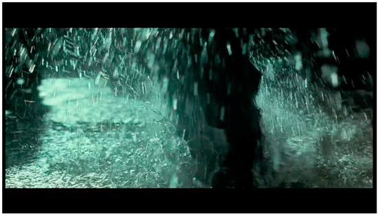 A thousand projectiles, each one a kinetic prism of light: catching, bouncing, bending. Bullets flying on a thousand different trajectories or joined together in a moving threshing wall. Particles that drift, particles that drive: crashing, splashing, glistening. Fluid chaos plus light. Rain: it’s every cinematographer’s dream (Figure 6).