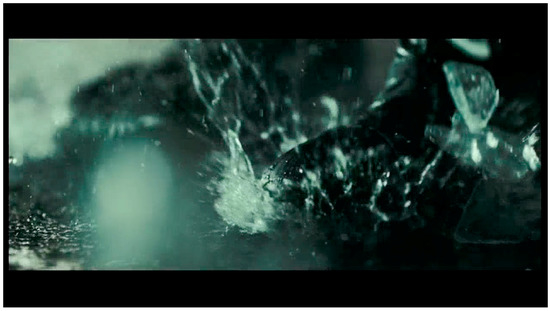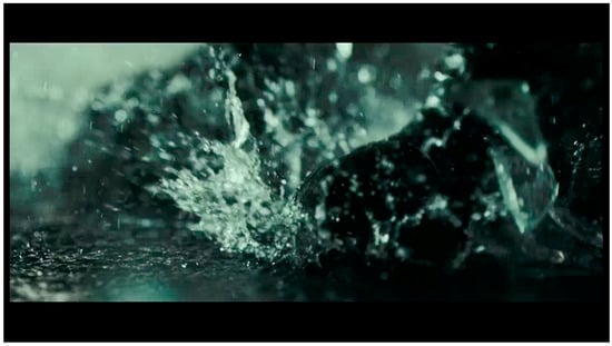 Wong says that the Wing Chun kung fu style ‘is not actually very eye-pleasing; it’s too straightforward, too simple. The only thing you can emphasize is its directness, and also its power’ (Ebiri 2013). The solution was to stage the fight in heavy rain and capture that rain in ‘step print and languorous high-frame slow-motion’ (Rizov 2014). He says, ‘when you shoot it at, like 500 frames per second, you can actually see how these raindrops interact with the actions, it’s very beautiful’ (Stasukevich 2014).3 The result is raindrops elongated into a moving thatch of white streaks, pools shimmering with an uncanny movement and crystalline splashes that capture the precise trajectory of water across the frame (Figure 11 and Figure 12).