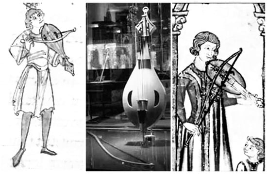 Initial paintings show the emergence of sound-holes in musical instruments Roman fiddle adapted from the manuscript London Br. Libr., Arundel. 91 (fol°218v°), eginning of the 12th Century (left), Vièle recreated for the Museu de la música in Barcelona, 2006 (center), Gothic fiddle, Cantigas de Santa Maria, Spain, 13th Century (right) (Rault 2014).