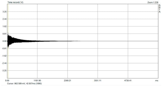Then, sets of “perfect” impulse responses were selected based on the excitation signal. This was done by eliminating any double hammer hits, eliminating any recordings where the researcher commented during the experiment that it was a bad hit, then finally choosing from the remaining possibilities the force hammer impulse with the narrowest and highest peak. Selected signals were transferred digitally to a computer for analysis.