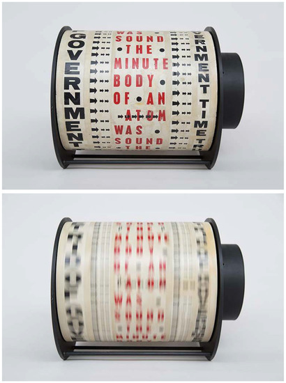 Get Rid of Government Time by Liliane Lijn, 1962; frame modified in 1965. Letraset on painted metal drum, plastic, painted metal, motor, 29.5 cm × 38 cm × 30 cm. Words from a poem by Nazli Nour. Photographs by Richard Wilding (2014) and used by permission. Collection of Stephen Weiss.