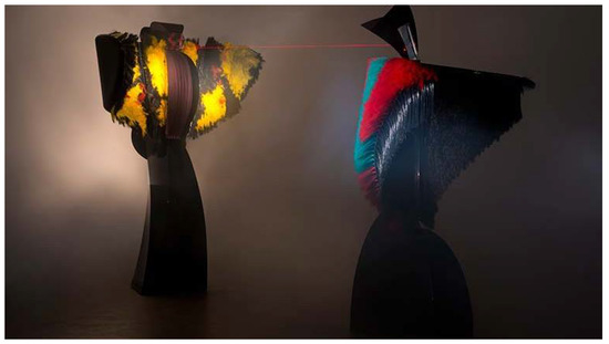 In the 1980s, I began to create works that represented female archetypes or goddesses. Apparitions of feminine power and inner energy, Woman of War (1986) and Lady of the Wild Things (1983) (Figure 3), are pure machine art come alive. They perform a six-minute drama that includes movement, sound, and light. They are interactive and automated. They both contain and are themselves machines. However, they do not appear to be machines; one could even say they do not appear “deterministic” or even repetitive, no more than a piece of theater or a film watched over and over might seem. They do not appear to be machines, because of their complexity and because I have given my human voice to the Woman of War. The Lady of the Wild Things listens to that voice and transforms the sound into light, 250 LEDs flickering in red and green through a feathery pair of wings made of steel and PVC fibers, responding to the volume and pitch of my recorded voice.