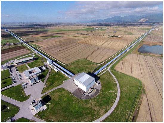 Aerial view of the Virgo European Gravity Observatory near Pisa, Italy. Photo courtesy Wikipedia (https://commons.wikimedia.org/wiki/File:VirgoDetectorAerialView.jpg) under the Creative Commons CC0 1.0 Universal Public Domain Dedication.
