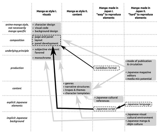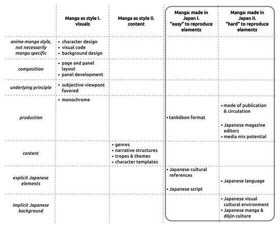 Without attempting to provide a comprehensive overview here, in Figure 1. below I have collected a number of different characteristics that are often either said to characterize manga and/or are mentioned as being responsible for the uniqueness of manga. I have tried to group these elements together according to what aspect of manga they correspond to (in the rows) on the one hand, and based on the distinction—namely style versus made in Japan—I find most important in relation to the what is manga debate (in the columns).17 The columns “visuals”, “content”, and the “made in Japan” columns together also correspond to the three-level model proposed by Lefèvre for “comparative comics research” to account for not only “formal properties” and “genres, themes and characters” but also for “how comics are produced and consumed” (2010, p. 87).
