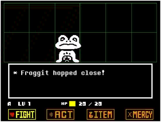 A screenshot from Undertale showing the first random encounter of the game, in which a “Froggit” “hops close” (note that aggression is implied via the convention of a random encounter but not by the text). The options are “fight,” “act,” “item,” and “mercy,” the last of which is unconventional. Screenshot by Peter Mawhorter, licensed under Creative Commons Attribution-ShareAlike 4.0 International License (CC BY SA).