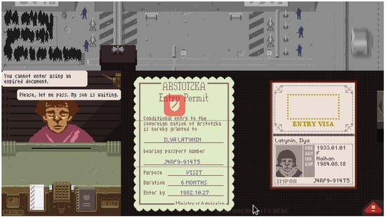 Papers, Please () gives the player the role of a border inspector in the fictional autocratic regime of Arstotzka. Struggling to support their family at home, they are challenged to quickly inspect passports, visas, and eventually travel permits and vaccination records to either permit or deny entry for a stream of hopeful immigrants and travelers, earning money for each applicant correctly approved or denied. A central part of the game is unresolved ambiguity, both about the identities and claims of those seeking entry and about the motives and legitimacy of the government and opposing revolutionary forces. () gives a nice overview of the game from a critical perspective, and () provides a detailed analysis of its systemic engagement with a variety of moral issues.