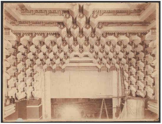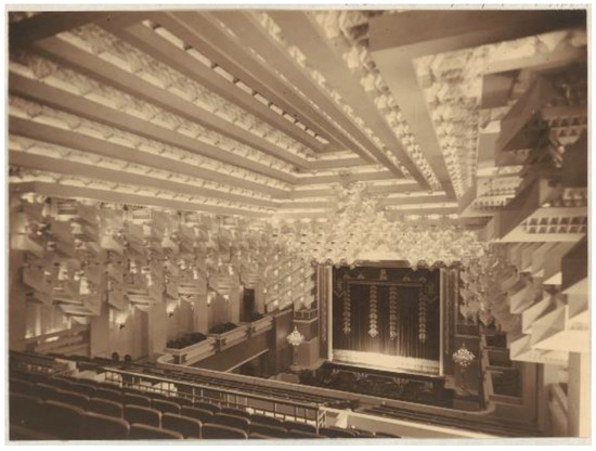 Located opposite the Town Hall on Swanston Street, the luxuriously appointed Capitol Theatre is largely considered to be Australia’s first reinforced concrete skyscraper (Pont 2003, p. 75) (see Figure 3 and Figure 4). Scholars, looking back, considered the Griffins’ Capitol Theatre’s auditorium ceiling and wall design as the most remarkable project of their some twenty years in Australia, which at the time was the national capital. This theatre project produced a conundrum of material ornamentation, something excessively bright. Acquiring reputations such as the finest cinema in the world (French 2017, p. 1), this technologically advanced venue is worth dismantling for its European modernist underpinnings, American Jugendstil garden effects, and Mesoamerican echoes. The Capitol auditorium’s highly ornamented metaphorical triangular crystals are set within a serrated lattice of fretted plasterwork. Its walls are shattered into V-shaped prismatic compartments upon which a thousand concealed globes once poured light in a myriad of colours, creating a “prismatic torpedo-shape” (Boyd 1965, p. 186) interior landscape. Its interior reflects the kaleidoscopic opals as depicted in Katherine Susannah Prichard’s novel, The Black Opal (1921), where “the colours in the stones—blue, green, gold, amethyst, and red—melted, sprayed and scintillated…” (Prichard [1921] 1973, p. 138); the novel was published during the Griffins’ auditorium’s construction.