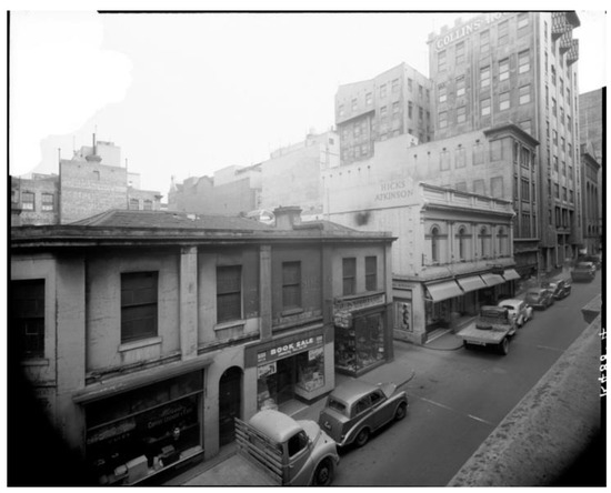 Collins House (1914) in the upper right-hand corner showing the three revolving block prisms; Little Collins Street, south side between Queen and Elizabeth Streets, Melbourne, ca. 1952. Photograph by Lyle Fowler. Harold Paynting Collection, State Library of Victoria. Out of copyright.
