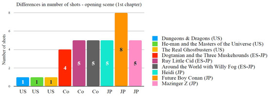Comparative chart between some early 1980’s American cartoons, Japanese anime series and animesque Euro-Japanese co-productions, according to the number of shots used in the first chapter’s opening scene. Chart by author ©2018 José Andrés Santiago Iglesias.
