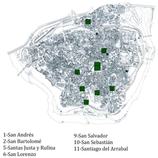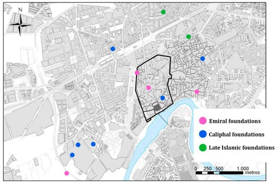 For achieving this, the study of these buildings per se was required first. This involved the identification of all the former mosques and the analysis of their structure and general arrangements, typologies, and layouts, and their chronological identification as well. Despite the number of mosques identified in Córdoba at present is lesser than the figures transmitted by written sources (see González Gutiérrez 2014, pp. 298–99), up to date scarcely a dozen of complexes have been identified as former secondary mosques (see Figure 2). Their states of documentation and conservation are, besides, quite uneven.