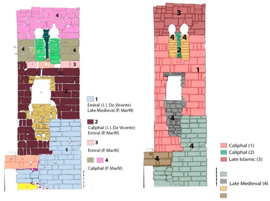 There are still standing remains of some of these mosques, specifically several minarets which were transformed into bell towers. Even though most of them have been recently restored and, therefore, the observation of the medieval Islamic techniques becomes hard, there are still some examples in which the traditional wall-reading techniques can be applied. It is the case of the minaret reused as bell tower in the church of San Lorenzo, whose chronological evolution has been reinterpreted through the architectural analysis of its visible faces (González Gutiérrez 2016a, pp. 293–96). Its possible foundational plaque states that the minaret was erected or refurbished in caliphal times, during the rule of al-Hakam II. Nevertheless, recent research has suggested a possible emiral origin of the tower (Marfil 2010, p. 54; De Vicente 2014, p. 27). Our revision on these readings, put in relation with other andalusí examples, has brought different results16 that are summarized in Figure 3.
