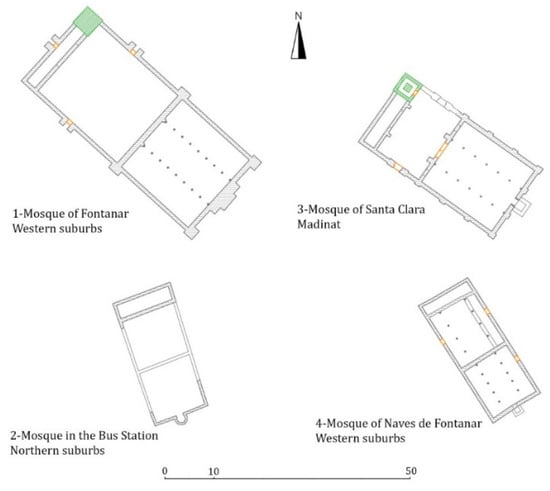 We have not managed to calculate overall proportions that determined the general dimensions chosen for each building. It is probable that the size of these mosques depended more on the conditions of the plots where they were erected. Given that three of the four mosques analyzed were caliphal, it has not been possible to suggest a wider chrono-typology beyond the limits of the caliphate. Thus, new archaeological evidence is required to complete our vision and clarify our hypotheses.