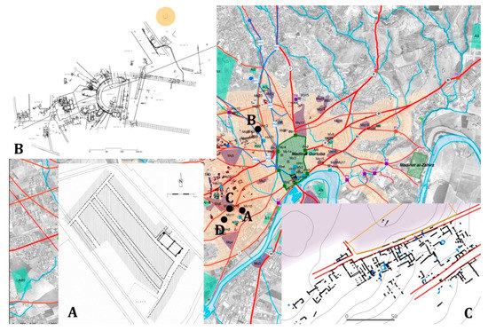 The cited patterns were respected during the Caliphate, in which mosques continued to occupy a prominent place in road networks and neighborhoods. The ultimate expression of the latter is documented in the western suburbs. Here, there were mosques built before the rest of the infrastructure, as it is the case of the mosque in Fontanar (see Figure 6a). Placed at the confluence of the neighborhood’s main streets, this area probably experienced dense traffic of people and activities. Next to it, another masŷid was built in the most topographically prominent spot of the suburb (mosque in the Centro de Transfusión, see Figure 6d, (Sánchez Madrid 2005)). In addition, some sectors already emerged during the Emirate will be now provided with new infrastructure, among which mosques can be detected (mosque of Naves de Fontanar, see Figure 6c). Emiral mosques continued to be active, and even some of them were renovated or enlarged. The continuation of the Islamization policy initiated then will be continued now as well. It can be detected, for instance, in the Christian suburb located north of the walled perimeter, which was provided with a mosque in the 10th century. The introduction of this building brought the urban regression of the Christian areas in benefit of the new Islamic suburb, which experienced a notable growth from this moment on.