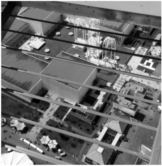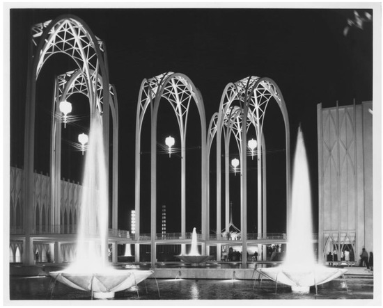 Gyure 2017, p. 162). Whether intentional or otherwise, the geometric latticework suggested a modern infrastructural architecture that undeniably recalls fine tracery from the Gothic cathedrals of Europe. And yet, the ethereal or space age theme is underscored in the light fixtures suspended from the towers, making them appear as though they are satellites orbiting in a pseudo-historical representation of outer space, firmly tethered to the earth. The effect was particularly spectacular at night (