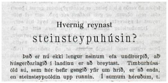 Það er nú ekki lengur neinum efa undirorpið, að húsagerðarlagið í landinu er að breytast. Timburhúsaöld sú, sem hér hefir gengið yfir um hrið, er að enda, en steinsteypuöldin upp runnin. [There is no longer any doubt that the way we build houses is changing. The age of timber, which has been going on for a while, is about to end, but the age of concrete is rising.](Jón Þorláksson 1911, p. 207)