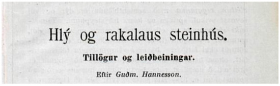 - Hannesson, Guðmundur. 1913. Hlý og rakalaus steinhús. Tillögur og leiðbeiningar. Búnaðarrit, vol. 27, 1–26. [Google Scholar]
