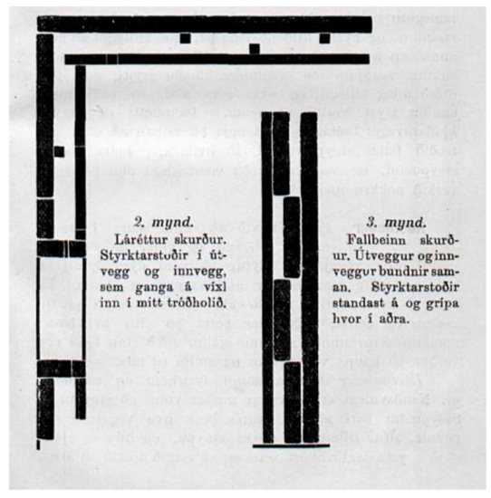 Damp and cold interiors were far too common, especially due to the lack of skilled labour and to the rain while casting the walls, which resulted in houses that were “unsuitable to live in.” Moreover, Guðmundur Hannesson asserted that single walls without padding were “far too cold” for construction in the countryside (Guðmundur Hannesson 1913, pp. 3–4). In order to find a solution, the doctor described several methods for casting double walls, showing various sorts of insulating layers. Padding could be of timber and cardboard panels, sawdust, peat chunks, dry turf, or pumice. By use of elementary drawings (Figure 4), the author also suggested different ways of connecting the outer and the inner walls in order to provide more resistance to earthquakes (Guðmundur Hannesson 1913, pp. 14–15).