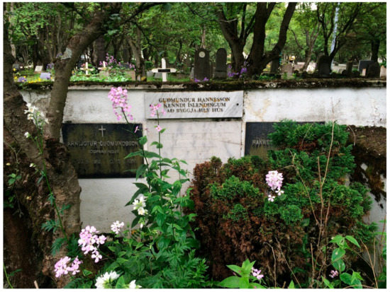 Guðmundur Hannesson’s article, which dreamt of “warm and dry” houses, was accepted with enthusiasm by those who read Búnaðarrit, to the point that a few years later a reader wrote about his experience in building a house by following the doctor’s suggestions (Björn Guðmundsson 1916). Apparently, such was Guðmundur Hannesson’s lifetime dedication, as reported by the doctor’s daughter years after his death (Anna Guðmundsdóttir 1974, p. 107), that he was said to have asked his American colleague Alan Gregg—an officer at the Rockefeller Foundation—to put the following inscription as an epitaph on his grave, which still stands today in Reykjavík’s cemetery of Hólavallagarður (Figure 5):