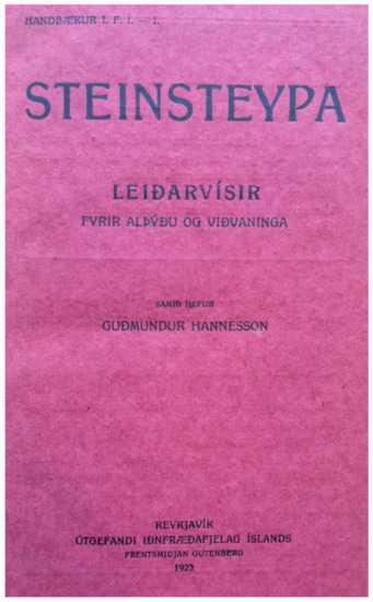 Guðmundur Hannesson’s technical knowledge and training vocation on the use of concrete reached its peak with the publication of a handbook (Figure 6) titled Steinsteypa. Leiðarvísir fyrir alþýðu og viðvaninga [Concrete: A Guidebook for Common People and Beginners], published in 1921 for Iðnfræðafélag Íslands [The Icelandic Craft Society].