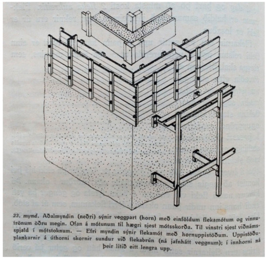 In a little more than 100 pages, he offered a record of the composition of the material, its mechanical strength and a brief description of the several applications that concrete might have in the building field. Short notes on the use of iron and steel bars for the reinforcement of concrete were also included (Figure 7), together with axonometrical drawings of wooden formworks (Figure 8) (Guðmundur Hannesson 1921, p. 72). Detailed descriptions of several kinds of timber formworks are included and some of them, in Guðmundur Hannesson’s later book titled Húsagerð á Íslandi [The Construction of Buildings in Iceland], will appear with specific names, such as: Sveinatungumót [formwork of Sveinatunga], tangarmót [pliers formwork] and Reykjavíkurmót [formwork of Reykjavík] (Figure 9).