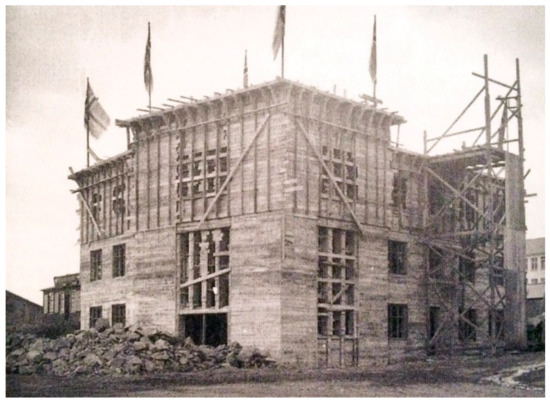Furthermore, because of the political meaning associated with the State architecture, concrete assumed new connotations that went beyond the mere debate on the practical and technical issues highlighted by Guðmundur Hannesson. As underlined by Seelow, this material became a metaphorical tool for the “liberation from the Danish building technique and architecture” (Seelow 2011, p. 73). This nationalist affirmation of the country’s political status through architecture and its materials was endorsed enthusiastically by the politician Jónas Jónsson, also known as Jónas frá Hriflu, (1885–1968), in an equally enthusiastic and nationalist book (Figure 11) titled Íslenzk Bygging: Brautryðjandastarf Guðjóns Samúelssonar [Icelandic Construction: The Pioneering Work of Guðjón Samúelsson]: “Steinsteypan var fyrsta varanlega byggingarefni Íslendinga [Concrete was the first enduring building material of the Icelanders]” (Jónas Jónsson 1957, p. 108). Jónas Jónsson was an extremely influential politician related to the centre-right Framsóknarflokkurinn [Progressive Party], and his endorsement for steinsteypa placed concrete within a very interesting debate, confirming that “Concrete is political in many senses” (Forty 2012, p. 145). As a matter of fact, concrete in Iceland was not only going to be the building material of functionalism that reached the island after 1930 (Seelow 2011, p. 175), but also became a physical metaphor for the rhetoric of a truly “Icelandic construction”, in the heated quest for a national style that spread through the country in the years before independence.