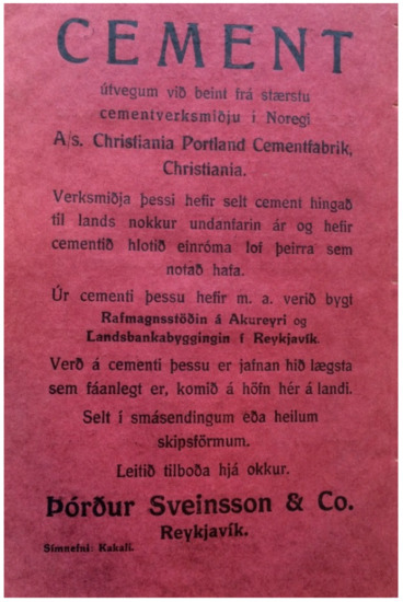 Traces of Iceland’s fascination with cement, and consequently with concrete, can be found in local newspapers since 1851 (Bóndi 1851; Pétur Pétursson et al. 1851), although the first application of cement appears to be even older, in the form of cement‒lime mortar on the walls of the Dómkirkjan [Cathedral] of Reykjavík, built in 1847 (Guðmundur Hannesson 1942, p. 241). Yet, it is around the 1870s‒80s that the issue of beton, shortly afterwards given the Icelandic name steinsteypa [literally: cast stone], appears to be more and more popular among the newspapers of the island (Helga Helgason 1883; Georg Ahrens 1885). As a matter of fact, in those very years, the first applications of concrete were made by Icelandic builders in the countryside (in Garðar, near Akranes, around 1878–1881, and at a farm of Sveinatunga, in the valley of Norðurárdalur, in 1895). Yet, what can be defined as a truly Icelandic epic of concrete started only at the turn of the century, when Jón Þorláksson (1877–1935), one of Iceland’s first engineers and a relevant politician, first defined the age that was about to come: