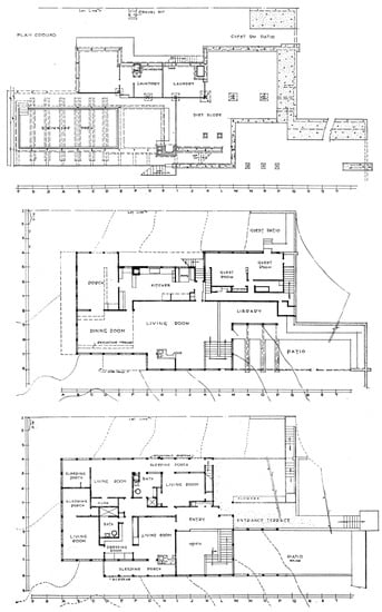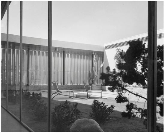 Both the Lovell and the Kaufmann Houses are built in luxurious neighborhoods and respect most conventions for the siting of high-class dwellings. For instance, they simultaneously offer great views and much privacy. The Lovell Health House sits on the steep slopes of the Los Feliz Hills of Los Angeles and enjoys sweeping views of the foothills and the city below. Since privacy was particularly important—the Lovells used to sunbathe in the nude (Lovell 1929, p. 26)—half of the pool is tucked beneath the house, thus protecting it from the neighbors’ views (Figure 2).34