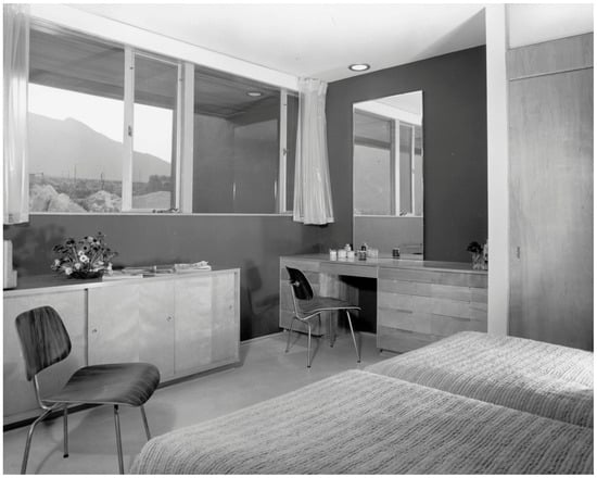 But still, at many Neutra houses, the hierarchy of spaces was expressed by the application of more or less prestigious materials. At the Lovell House, for example, dark wood paneling is limited to the representative rooms such as the entrance, the living room, the study and the master suite. Similarly, at the Kaufmann House, the owners’ and the guests’ rooms were marked by terrazzo floors and textile window drapes, while the maids’ rooms were fitted with plastic tiles and plastic curtains only (Figure 8).
