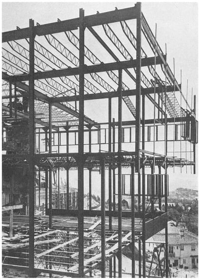 In defense of his expensive residences, Neutra argued that he used them to develop prototypes that would serve society at large by means of industrial reproduction. Such a prototype was, according to him, the steel skeleton of the Lovell Health House (Figure 9).47 Correspondingly, he presented it as a generally valid answer to the question how the heavy steel skeleton of large buildings can be adopted for light residential construction in a rational and therefore economical way. Its modular grid was determined by standard window sizes, resulting in surprisingly short spans of 5′–1½″ (156 cm). These short spans and the avoidance of any bending stress by hanging the balconies from the cantilevering roof resulted in very slender columns of 4″ (10 cm). Its floors were mainly constructed by the just recently (1923) introduced prefabricated open web steel joists (Steel Joist Institute 1946, p. 2), which allowed the easy installation of ducts. Maybe it was here that such joists had been used for the first time in a residential building (Neutra 1962, p. 222). But the Lovell House was certainly not the first steel-framed residence of the United States, as it has often been suggested.48 This honor probably goes to the Niels Poulson House in Brooklyn, which was already constructed in 1890 (The Prefabricated House IV 1943, p. 74).