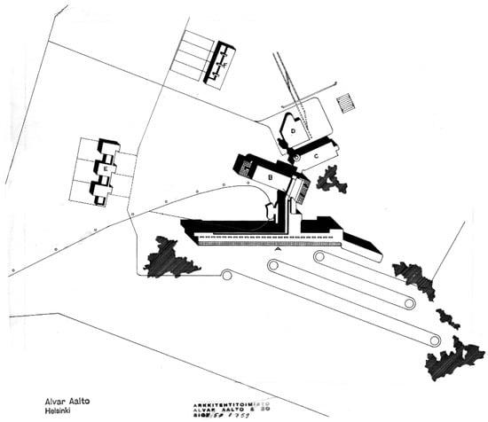 Site plan showing the main building and its wings (A–D), the Junior Physicians’ and Administrative Director’s terraced house facing the hospital entrance (E) and workers’ apartment building (F). Detail of drawing No. 50-759, the drawing has been edited. Alvar Aalto Museum. Used by permission.